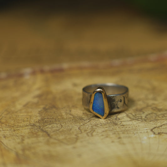 Bold Electric Blue Australian Opal Set in 9 ct Gold on a textured Sterling Silver Ring