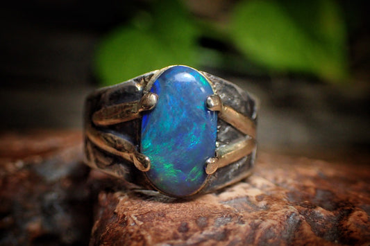 Solid Lightning Ridge Opal in Textured Silver Ring with Gold Embellishments ~ Bohemian Pirate Style / Band US Size 9.75