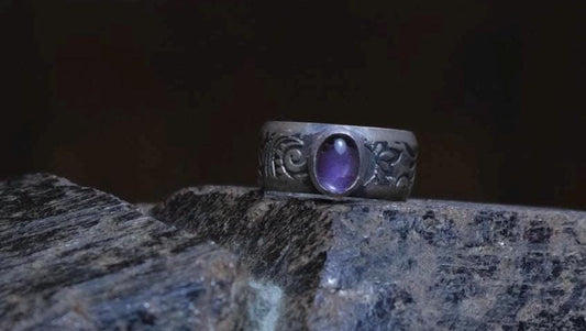 Natural Amethyst Set on Paisley Textured Wide Banded Sterling Silver Ring US Size 6 3/4