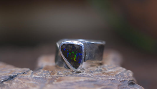 Rainbow Australian Boulder Opal on asymetrical Sterling Silver RIng Size 8.5