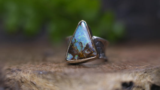 Bold Electric Blue Australian Opal Set in 9 ct Gold on a textured Sterling Silver Ring